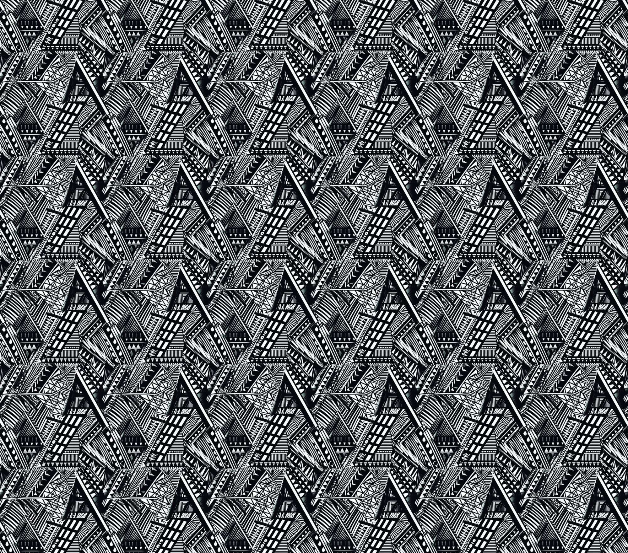 Dit fotobehang zwart wit tribal patroon toont een complex netwerk van lijnen, driehoeken en symbolische vormen. De compositie bestaat uit verschillende geometrische motieven die samen een dicht grafisch patroon vormen.